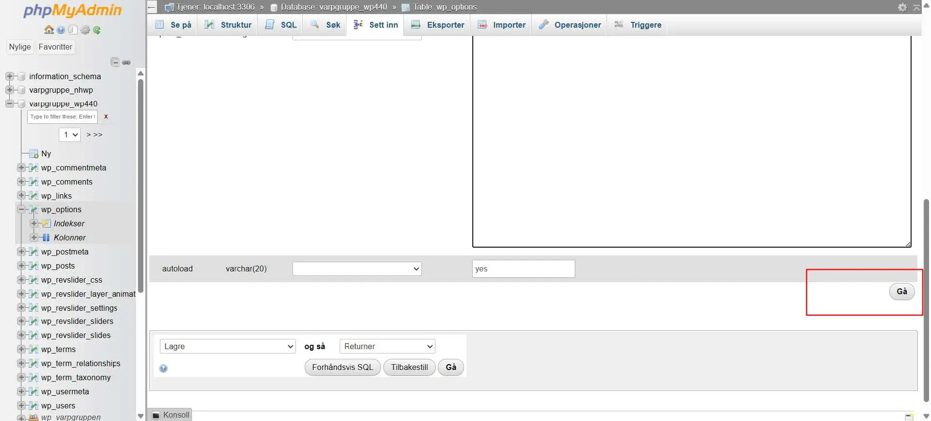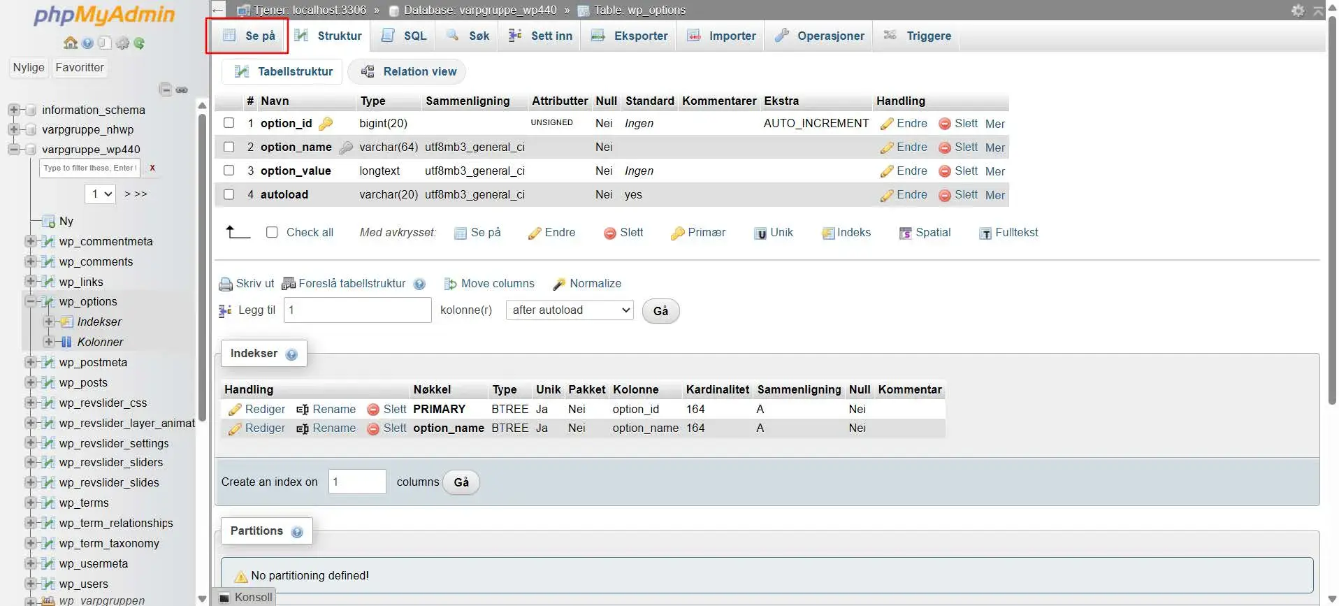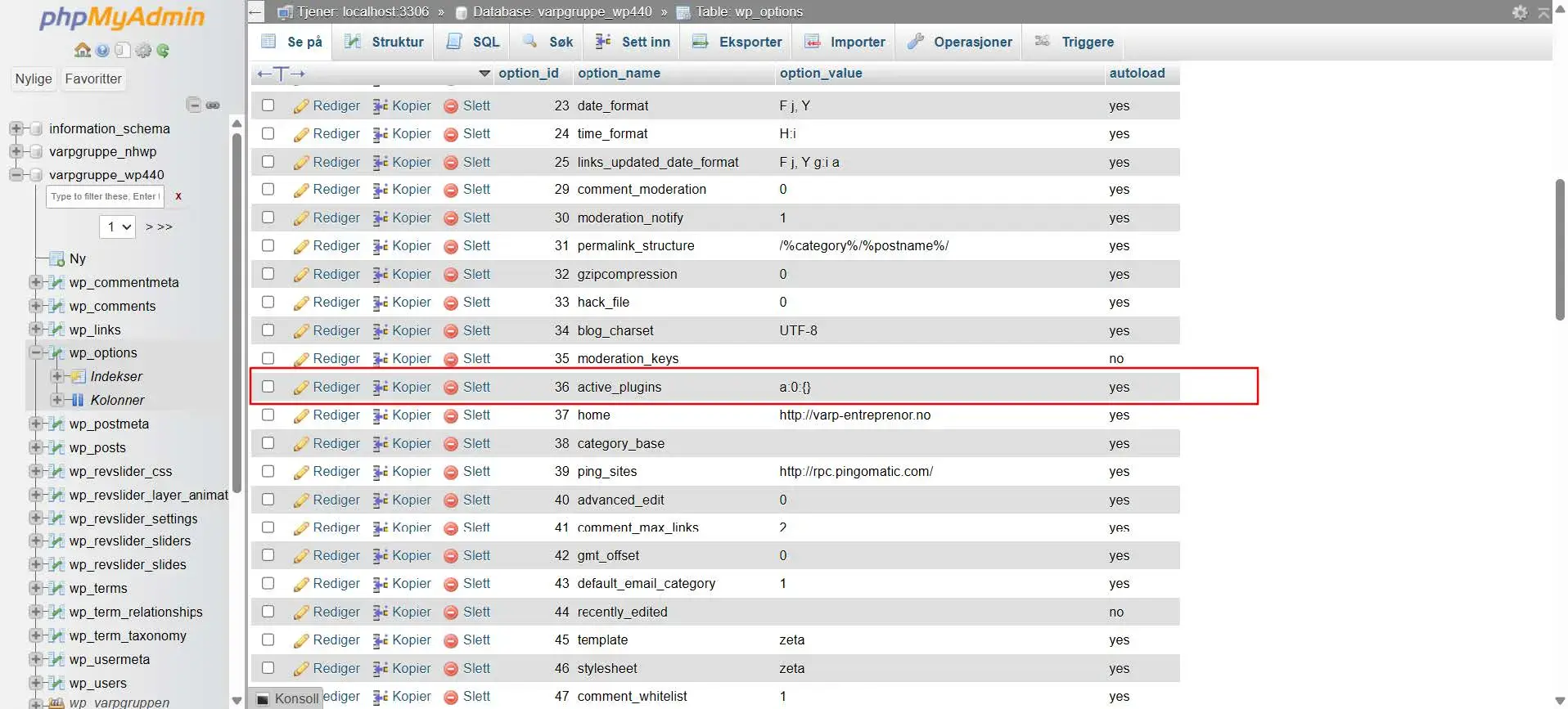 wp_options: Se etter raden som heter active_plugins.a:0:{}. Dette deaktiverer alle utvidelser slik at du får logget inn igjen.Viktig: Ta alltid en sikkerhetskopi (backup) av nettsiden før du gjør endringer i databasen eller sletter temaer!