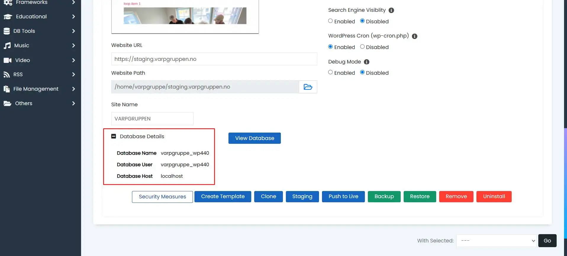 4. Scroll deretter ned til du kommer til DATABASER og klikk på phpMyAdmin. Da vil du se at databasen til staging nettsiden vargruppe_wp440 ligger i venstre kolonne.